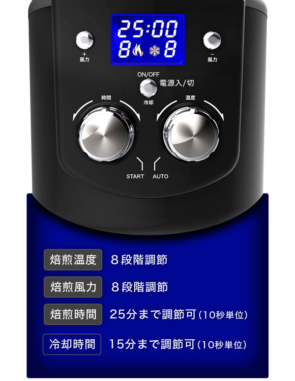 それぞれの操作は各種ボタンで簡単に行え、設定内容は液晶パネルでわかりやすく表示されます。 焙煎温度設定:温度ボタンを回すことで1〜8段階の温度調節ができます。 温度設定は焙煎中でも切り替えることが可能です。設定した温度は液晶パネルの左下に1〜8段階で表示されます。 時間ボタンを回すことで最大25分まで10秒単位で増減できます。 さらに、25分以上焙煎したい場合は、時間が減ってから時間設定ボタンで時間を追加してください。