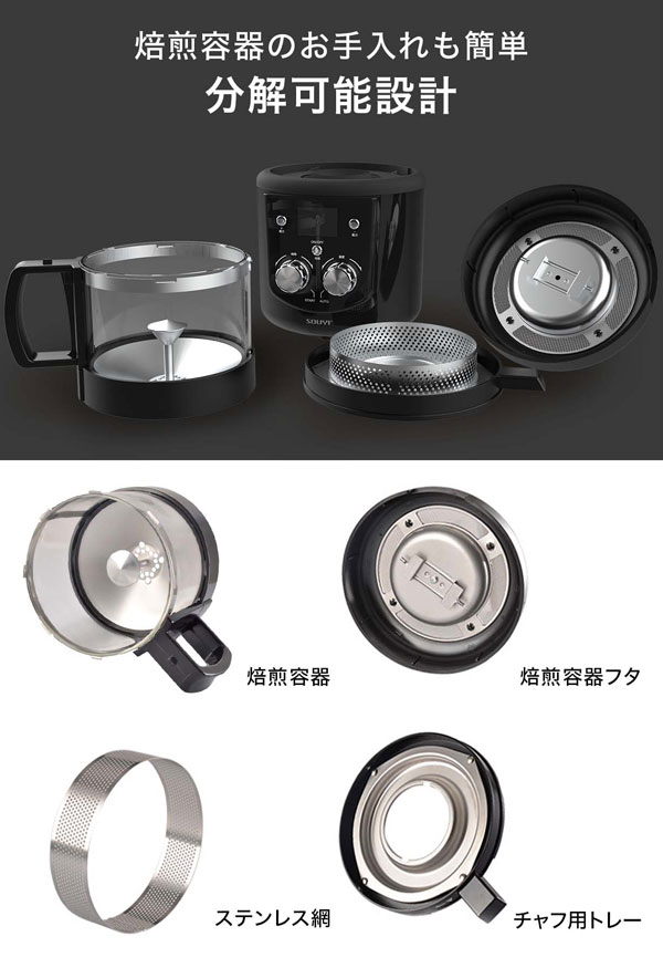そのため、焙煎できる焙煎度の幅が広がり、ガラス製の容器でコーヒー豆の焙煎経過を確認しながら、 自分好みの焙煎度に自由に調節することができます。
