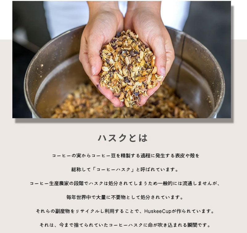 コーヒーハスクとは、コーヒーの実から豆を取り出す時に生まれる外皮や殻のことで、不要物として処分されます。「もしそんな不要なものを利用して素晴らしいものに変えることができたら?」という想いが形になったのが、HuskeeCupです。