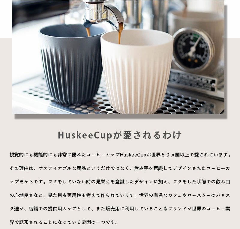 HuskeeCupが世界50ヵ国以上で愛用される理由は、サステイナブルな商品というだけではなく、飲み手を意識してデザインされたコーヒーカップだからです。フタをしていない時の見栄えを意識したデザインに加え、フタをした状態での飲み口の心地良さなど、見た目も実用性も考えて作られています。世界の有名なカフェやロースターのバリスタ達が、店舗での提供用カップとして、また販売用に利用していることもブランドが世界のコーヒー業界で認知されることになっている要因の一つです。