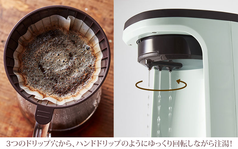季節を問わず、ホットコーヒーもアイスコーヒーも手軽にお楽しみいただけます。3つのモードから選んでボタンを押すだけのカンタン操作も嬉しいポイントです。 まるでハンドドリップのようにゆっくり回転し、弧を描きながら注湯!まんべんなくコーヒー粉にお湯が行き渡ります。