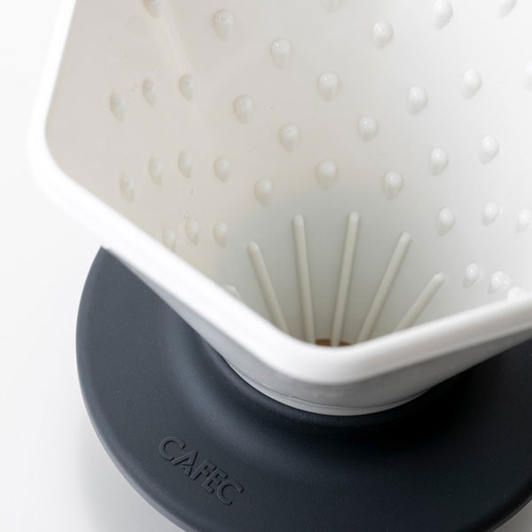 ペーパーフィルターは丸く、ドリッパー形状は6か所の角度に充分な空気層が維持されます。 さらに内側には点リブをつけ、ペーパーとドリッパーの間に、より多くの空気層を確保。この厚い空気層によって、コーヒー粉は十分に膨らみます。
