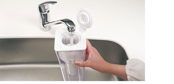 ろ過水容量0.9L(全容量1.35L)のコンパクトモデルなので、片手で持ってもラクラク注げます。