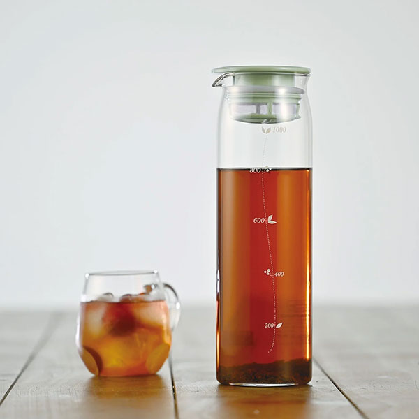 茶葉15g程を直接ポットに入れ、水を目盛りまで入れます。 フタをして冷蔵庫に入れ、3〜6時間置いてできあがり。 フィルターメッシュ付きのフタなので、そのまま注げます。