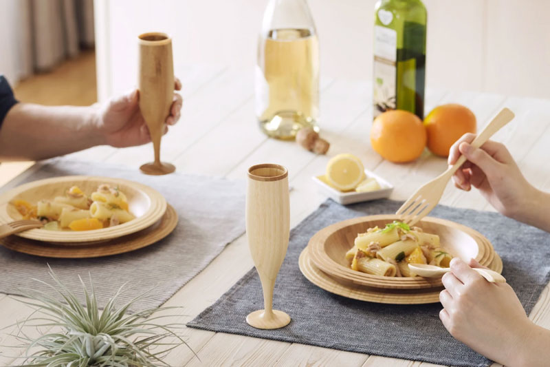 やわらかな曲線によって、上品でやさしい手ざわりを伝えるデザインになっています。 スパークリング系のお酒の場合、ガラス製や陶器にはない天然素材ならではの繊細できめ細かい泡立ちと、くちあたりにまろやかさを伝えます。