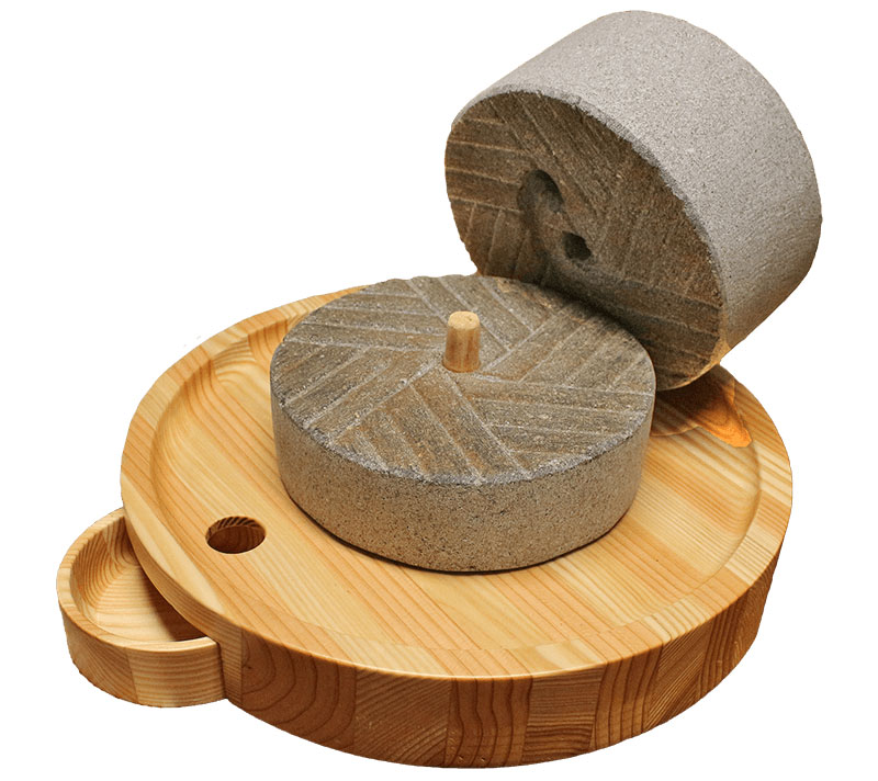 最良の石を選定し、ひとつひとつの男鹿石を「細やかで繊細な技」で石臼に仕上げます。石臼と同じくらい重要な受け皿は秋田杉を使用した良質の一品です。