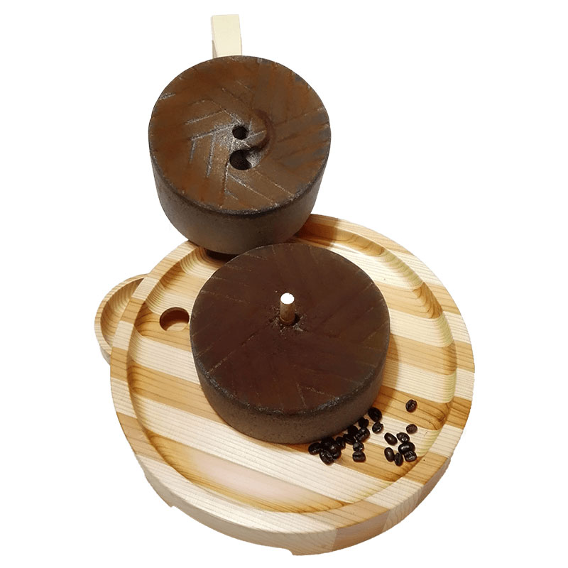 石臼コーヒーミルは、一般的に多く用いられている花崗岩ではなく、やわらかく酸化しにくい特徴を持つ秋田原産の安山岩の「男鹿石」を使用しております。天然の素材ですから、一つとして同じものはありません。豆を挽く工程で実感する濃厚な香りと石臼挽き独特の心地良い音をお楽しみいただけます。