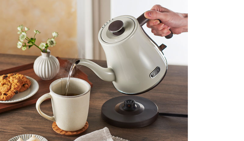 必要な分だけ水を入れたら、スイッチ一つで高速沸騰開始。ハイパワーなのでカップ1杯(120mL)が水温23℃の場合約60秒で沸騰し、忙しい朝にも最適です。 容量は使い切るのにちょうどいい0.8L。手にフィットする握りやすいグリップで、注ぎやすさもこだわりました。さらに「空焚き防止機能」が付いた安心仕様。 毎朝のコーヒータイムやリラックスタイム、リモートワーク時など、普段使いに便利な電気ケトルです。