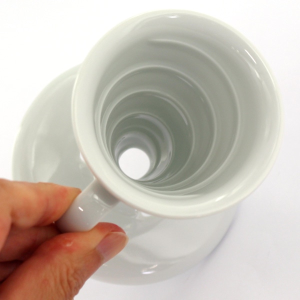 内側のスパイラルリブは抽出を促進し、コーヒーの粉に含まれるガスを逃すデザインになっています。 またドリッパーの土台部分に三角形の小さい窓があり、カップの上にそのまま乗せてもこぼれる心配はありません。 ペーパーは円錐形1-4人用ペーパーフィルターを半分に折ってお使いいただけます。