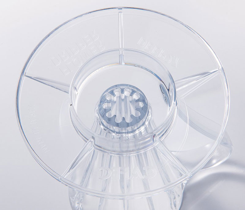 ドリッパーの台座にドーム状の曲線を付けたことで、ドリッパーとカップの距離を少し遠ざける工夫をし、カップにドリップされたコーヒーにペーパーの先が浸りにくいように設計しています! フラワードリッパーDEEP27は、トライタン樹脂製です。