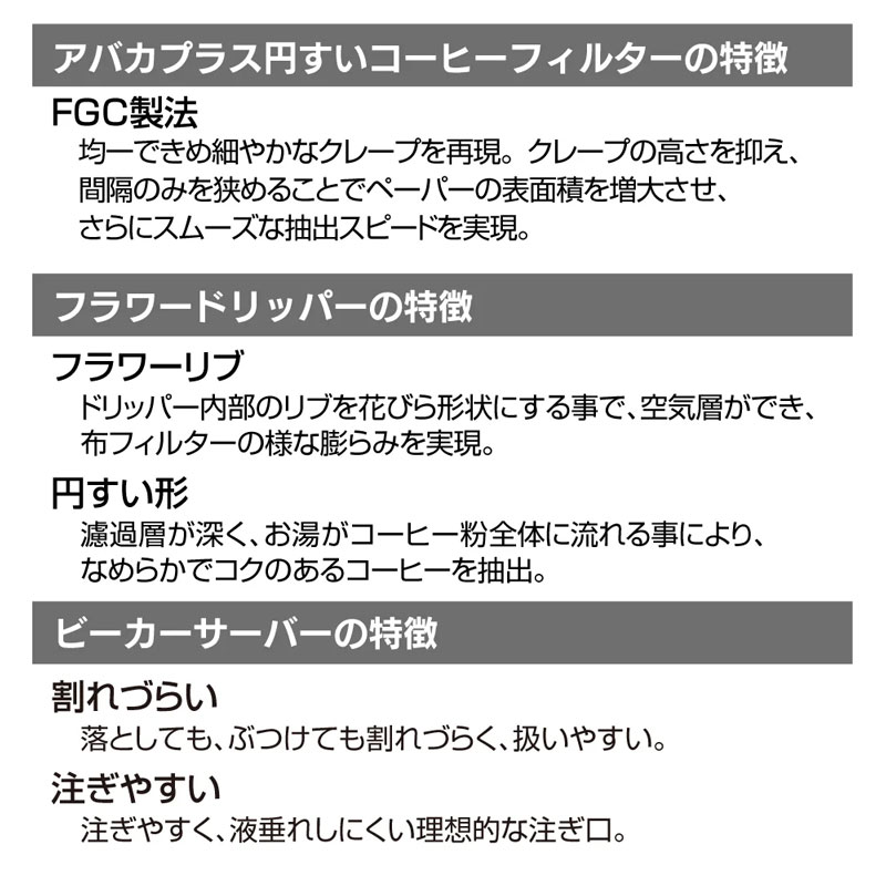 抽出スピードが、とてもスムーズ。均一な地合いで安定した抽出を可能にしたペーパーです。 スムーズで安定した抽出を可能にする構造がベースになっているので、 抽出スピードを自分の腕でコントロールすることも可能。 自分好みの味わいのコーヒーに仕上がります。
