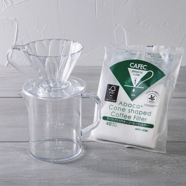 雑味は出さず、豆本来の美味しさだけを引き出す形 CAFEC式透過法理論を具現化した、花びらのようなリブが特徴の円すいドリッパーです。 ドリッパー壁を「抉る」形のリブを施すことにより、 コーヒー粉を十分に膨らませ、湯をドリッパー内に溜めることなくスムーズに抽出。 また、円すい形状により、コーヒー粉の深い堆積層を形成。 湯とコーヒー粉の接触距離をより長くし、 本来のフレーバーを十分抽出することを可能にしました。