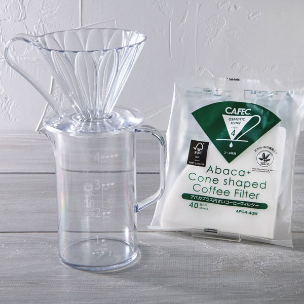 雑味は出さず、豆本来の美味しさだけを引き出す形 CAFEC式透過法理論を具現化した、花びらのようなリブが特徴の円すいドリッパーです。 ドリッパー壁を「抉る」形のリブを施すことにより、 コーヒー粉を十分に膨らませ、湯をドリッパー内に溜めることなくスムーズに抽出。 また、円すい形状により、コーヒー粉の深い堆積層を形成。 湯とコーヒー粉の接触距離をより長くし、 本来のフレーバーを十分抽出することを可能にしました。