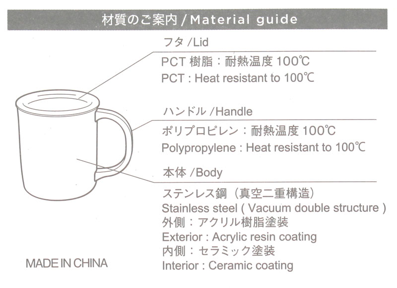 本体:ステンレス、フタ:PTC樹脂、ハンドル:ポリプロピレン