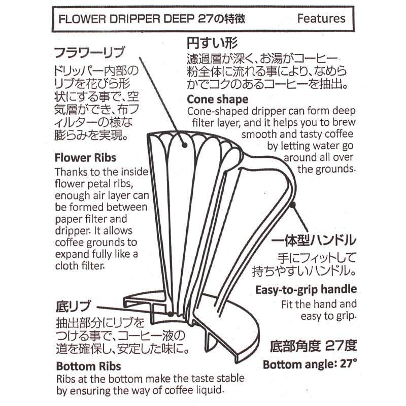 ドリッパーの台座にドーム状の曲線を付けたことで、ドリッパーとカップの距離を少し遠ざける工夫をし、カップにドリップされたコーヒーにペーパーの先が浸りにくいように設計しています! フラワードリッパーDEEP27は、トライタン樹脂製です。