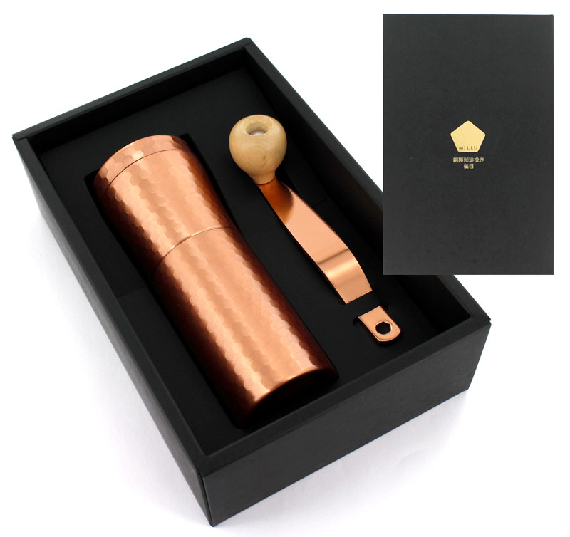 丁寧に押し出した趣のある素材の表面は、 槌目(つちめ)仕上げという技法で造られています。 他にない存在感のある機能美と、しっとり艶やかな美しさを持つ銅製ボディのコーヒーミルです。