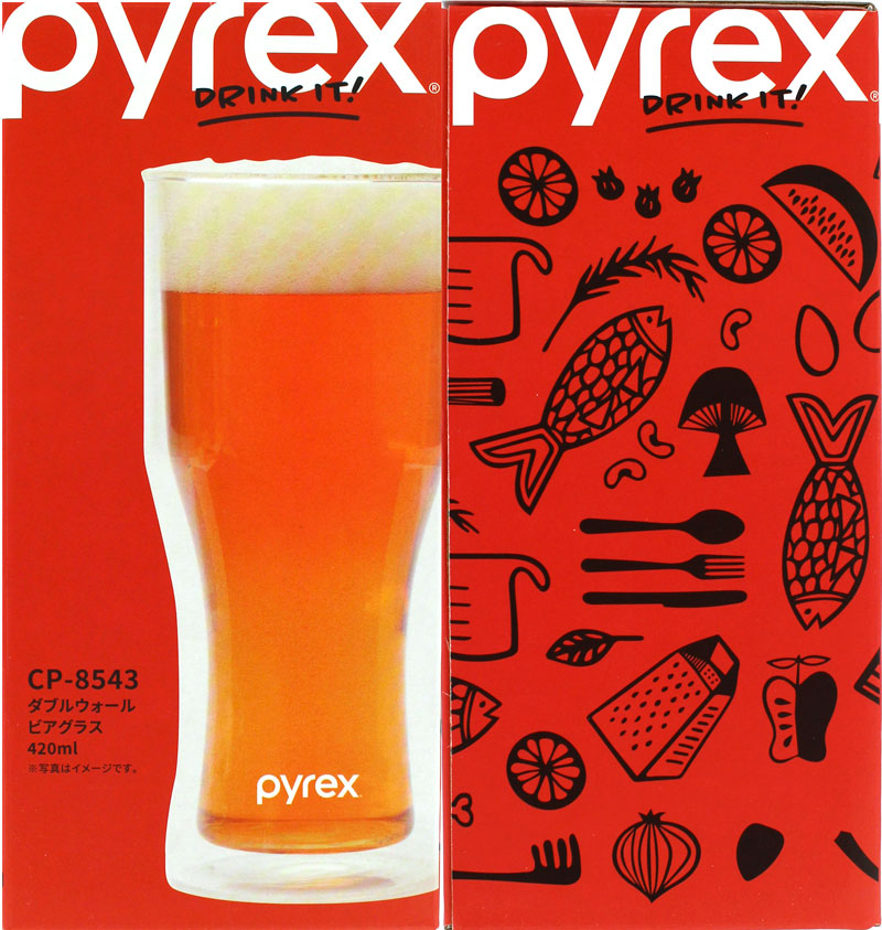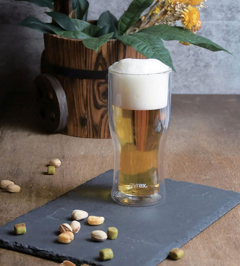 透明度の高いダブルウォールグラスのビアグラスです。なんとpyrexのロゴが表面ではなく、内側のグラスに入っている凝った造りです。 ダブルウォール構造なので、グラスに注いだ飲み物の温度を長時間キープ。耐熱ガラスの二重構造なので、温かい飲み物は温かく、冷たい飲み物は冷たく楽しめます。高い断熱性で、飲み物おいしさをより長く持続します。