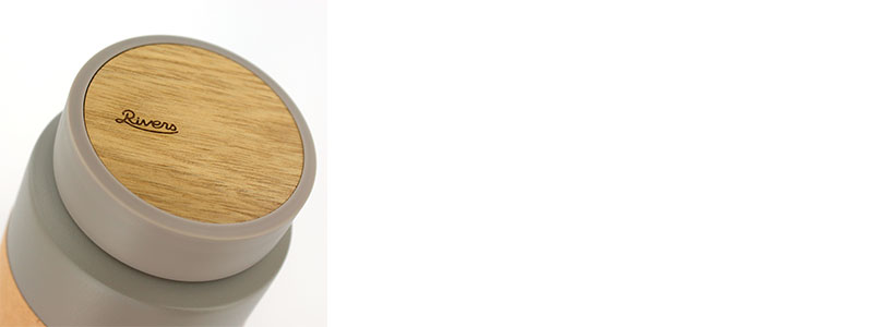 木製家具のような佇まいの真空ステンレスボトルです。 フタにアカシアの天然木がRIVERSのロゴ入りでさりげなく埋め込まれています。