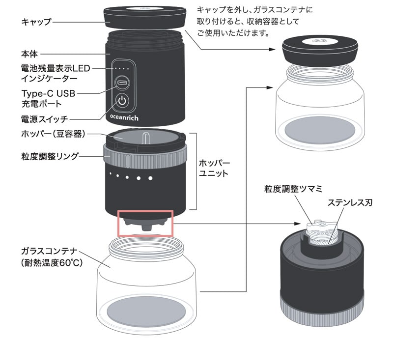 本体上部のキャップを取り外してガラスコンテナのフタとして使えば、コーヒー粉の保存や持ち運びに便利です。コーヒー粉だけを持ち運びたい時にも役立ちます。