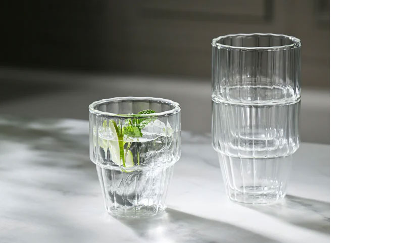 縦のラインが涼し気な、耐熱ガラス製のダブルウォールスタックグラスです。 ダブルウォールなので、冷たい飲み物も結露せずにお使いいただけます。 あたたかい飲み物は手に熱さが伝わりにくく、安心して持つことができます。 スタッキング可能なので収納スペースを取りません。