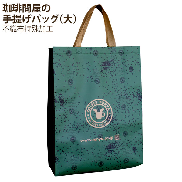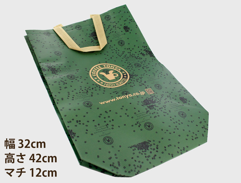 珈琲問屋オリジナルの不織布手提げバッグです。紙よりも丈夫な不織布で作られているので、安心して荷物を入れられます。 珈琲問屋の手提げ紙袋と同じデザインで、落ち着いた緑を基調とした色合いが特徴で、多くの方に好評をいただいております。