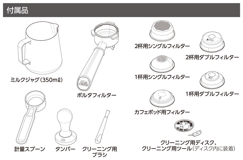 多層式のフィルターです。軽やかなクレマを作ります。フィルター自体に圧をかけて抽出するので、シングルフィルターのように細かな準備技術を要せずに、手軽にエスプレッソを楽しめます。(1杯用、2杯用の2種付属)