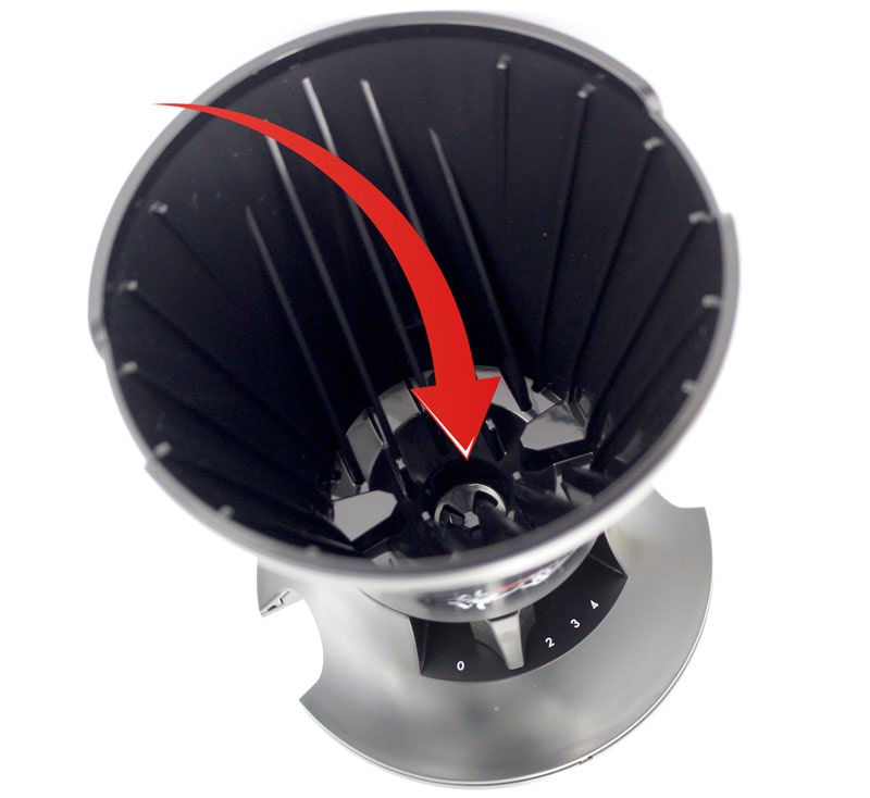 内側は深めのリブと底面に3つの抽出口が見えます。