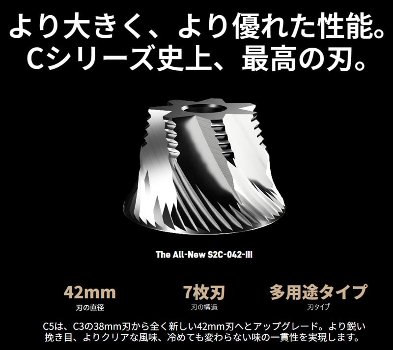タイムモア社の従来モデルの38mmから42mmへと大きく進化したS2C-042-IIIコニカル刃を採用。