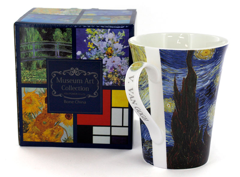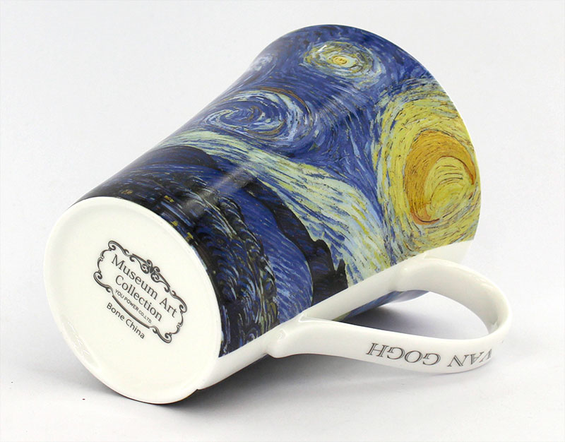 ゴッホやモネなど、名画の世界をそのまま閉じ込めたマグカップです。 持ち手の部分には絵画からのモチーフのワンポイントと作家名の英文字が入っています。