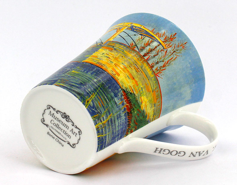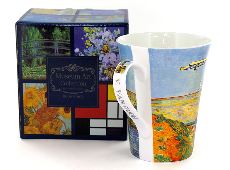 ゴッホやモネなど、名画の世界をそのまま閉じ込めたマグカップです。 持ち手の部分には絵画からのモチーフのワンポイントと作家名の英文字が入っています。