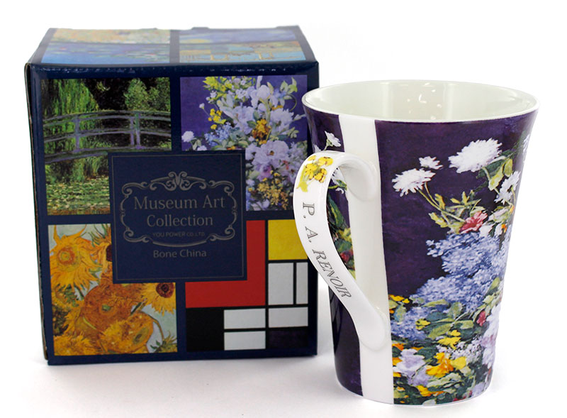ゴッホやモネなど、名画の世界をそのまま閉じ込めたマグカップです。 持ち手の部分には絵画からのモチーフのワンポイントと作家名の英文字が入っています。