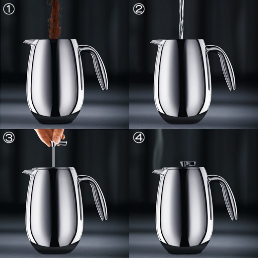 ポットのハンドルをしっかりと抑え、手の力のみを使ってノブに少しずつ力をかけ、プランジャーをポット内へまっすぐ押し下げます。プランジャーを出来るだけ力を入れずにゆっくりと押し下げてると、おいしいコーヒーが出来上がります。フィルターがつまっていたり、プランジャーが下げられない場合は、ポットからプランジャーを取り出し、ポット内をかき混ぜ、もう一度フタをはめて押し下げてください。