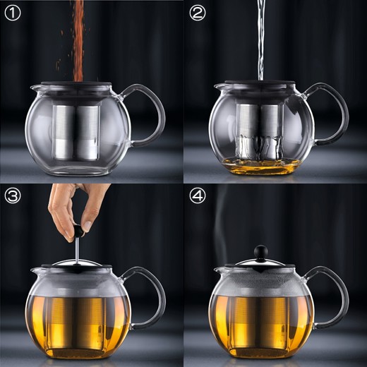 ボダムがそれまでに培ったフレンチプレスのノウハウを生かし、ティーポットにもプレス方式を採用しました。茶葉をフィルターの中で十分に動かしお好みの濃さに抽出した後プレスすることにより、茶葉をフィルターの底に封じ込めます。