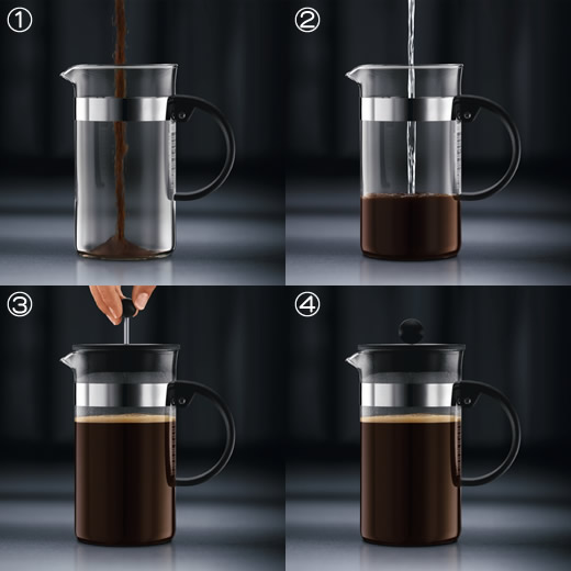 プランジャー部分をポットの上にはめます。この時プランジャーを押し下げないで下さい。この状態で最低4 分待ちます。