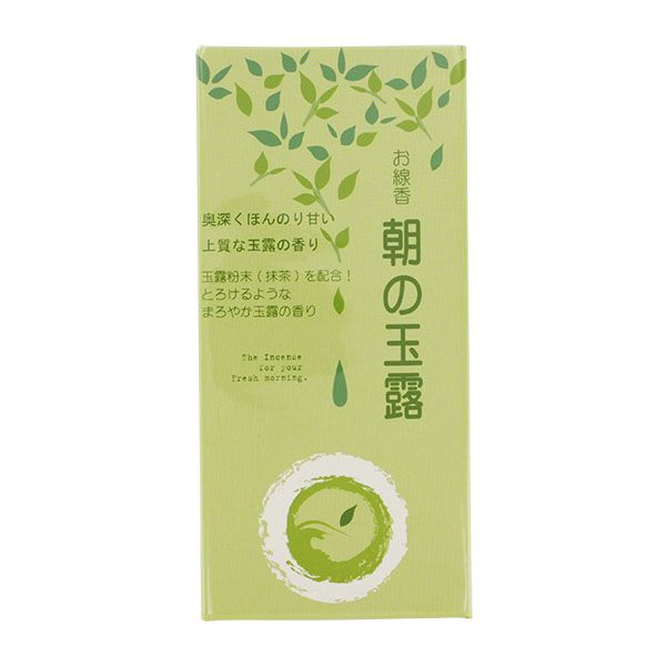 空気洗浄のお線香 「朝の玉露」奥深くほんのり甘い上質な玉露の香り。玉露粉末(抹茶)配合でとろけるような、まろやかな玉露の香りです。毎日お使いいただける、温かみのある香りで健やかな時間をお過ごしください。