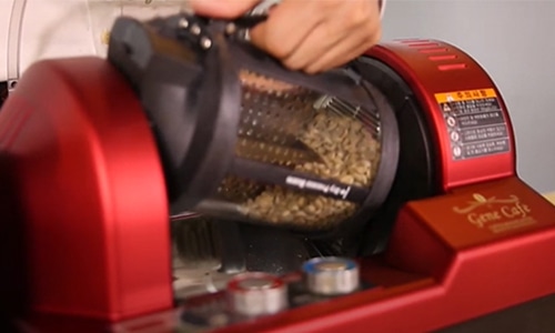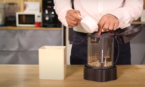 計量カップを使い、生豆を焙煎チャンバーに最大250gまで入れます。