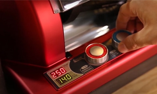 温度設定ダイヤル(赤)を回すとチャンバーが回転し焙煎がはじまります。焙煎が終了するとブザーが鳴り冷却が自動ではじめまります。