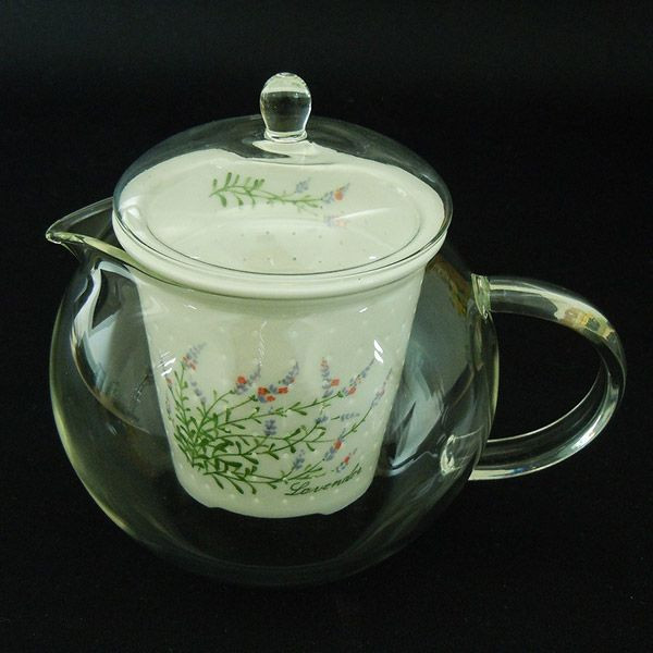 セラミックの茶こしのかわいい柄が、ガラスごしに見え、ティータイムをすてきに演出。