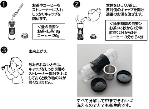 | 抽出時間の目安 | [コーヒー] 3分〜4分 [お茶] 45秒〜1分半 [紅茶] 2分〜3分 |