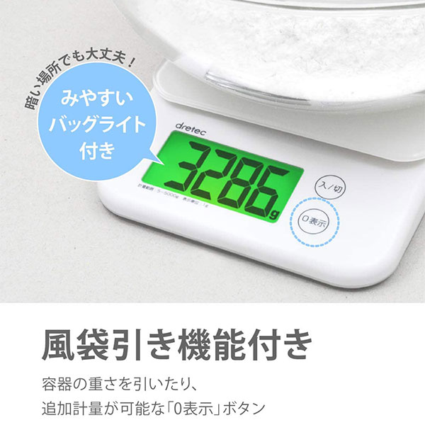 「0表示」ボタンで容器の重さを差し引いたり、材料別に追加してはかれます。