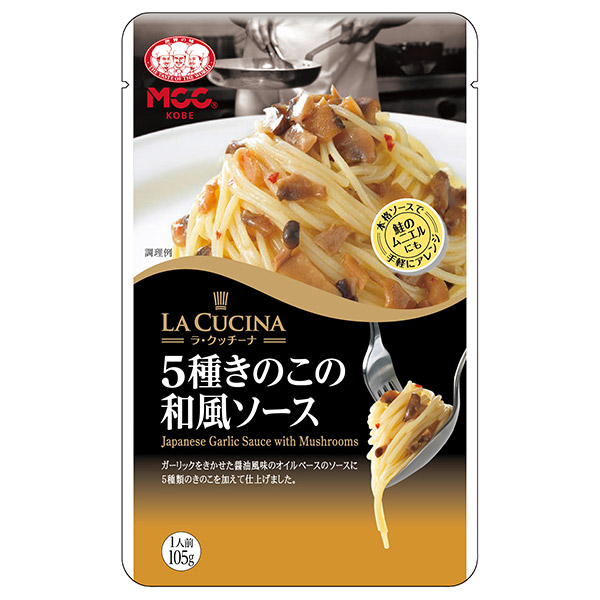 ガーリックをきかせた醤油風味のオイルベースのソースに5種類のきのこを加えて仕上げました。
