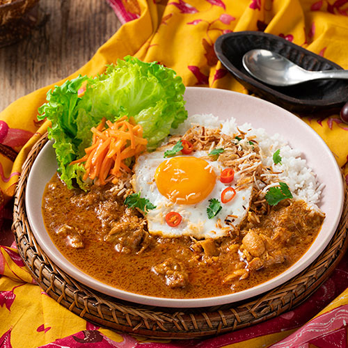 インドカレーの流れを汲んだ本場マレーシアの味を再現した本格的なカレーです。 直火釜でスタータースパイスを炒めて香味油を作り、たまねぎを炒めて旨味と甘味を引き立ててから鶏の油を加えてコクと深みを重ねます。カレー粉はマレーシアから輸入した専用品を使用。ココナッツは全体の味のバランスを考え繊細な風味をもたらすココナッツデシケート(内皮)を使用し、濃縮チキンブイヨン(厨房でコトコト炊くのと基本的には同じ製法)で鶏のナチュラルな旨味を再現しています。