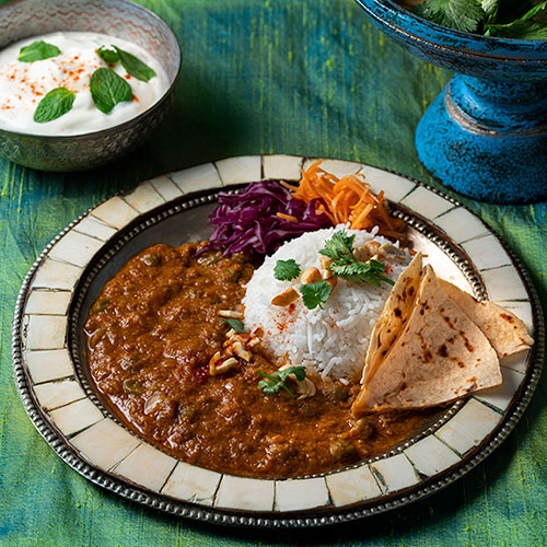 インド風チキンカレーと同様に、インドカレーの製法に基づいて一から作り込んだカレーです。直火でスタータースパイスの香りを油に移し、焦げる直前までたまねぎを炒め込み甘味と香りを引き出します。にんにくと生姜を炒めて、トマトペーストを加え更に炒めていきます。(※トマトペーストを炒めることでトマトの香りが立ち上がり、酸味が飛び、甘みが引き立ちます)。このベースに鶏挽肉を加えて炒めます(※挽肉には皮つきの鶏肉を使用することで、鶏の油から出る香りが立ちとコクが深い味わいになっています)。最後に仕上げ用のオリジナル・マサラを加えて味をまとめます。