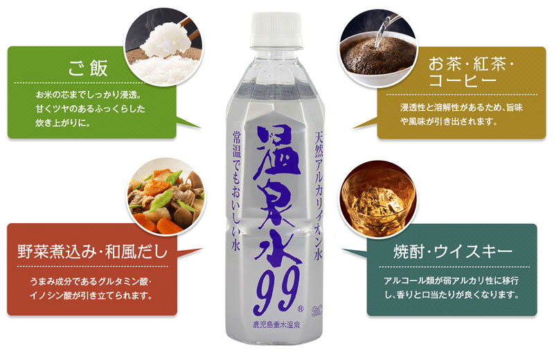 温泉水99(キューキュー)は、鹿児島垂水温泉、火山帯の地下750mより47℃で湧き出すからだにやさしい天然のアルカリイオン水です。
