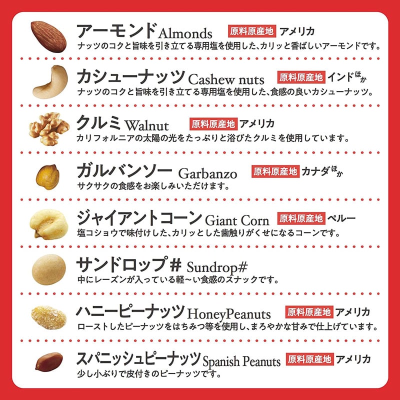 レーズンを衣がけしたサクサク食感が大人気のサンドロップ、など全8種類のナッツとスナックが入っています。