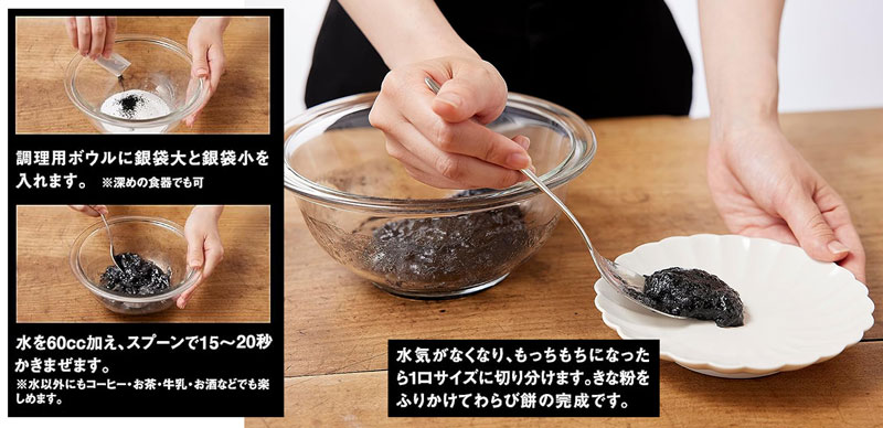 原材料名:グラニュー糖(国内製造)、でん粉、きな粉(大豆(国産))、竹炭粉末、ヤシ殻活性炭末、マルトデキストリン