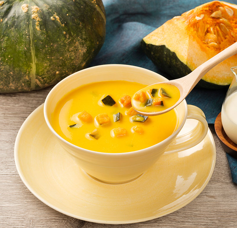 原材料名:野菜(かぼちゃ(北海道産)、たまねぎ)、生クリーム、牛乳、砂糖、チキンエキス、バター、食塩、香辛料/増粘剤(加工デンプン)、調味料(アミノ酸等)、(一部に乳成分・鶏肉を含む)