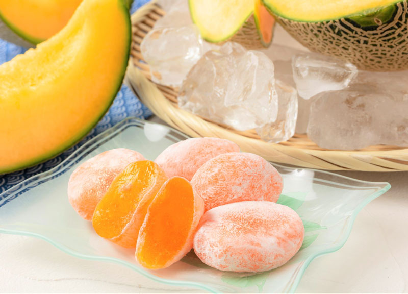甘く香り高いメロンの風味をもっちり食感のおもちに閉じ込めました。北海道産メロンのピューレをおもちに練り込んでいます。