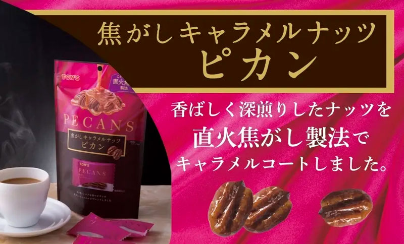 昔からピカンパイ等に愛用されるように、ピカン(ピーカンナッツ)とスイーツの相性は抜群です。 採用したピカンは、味・食感がいいだけでなく、焦がしキャラメル製法にマッチするものを選定しました。