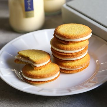 中にはホワイトチョコレートとカラメルクリーム生地には、 石川県のブランド米「ひゃくまん穀」の米粉を使用したさくさく食感のオリジナルのラングドシャです。